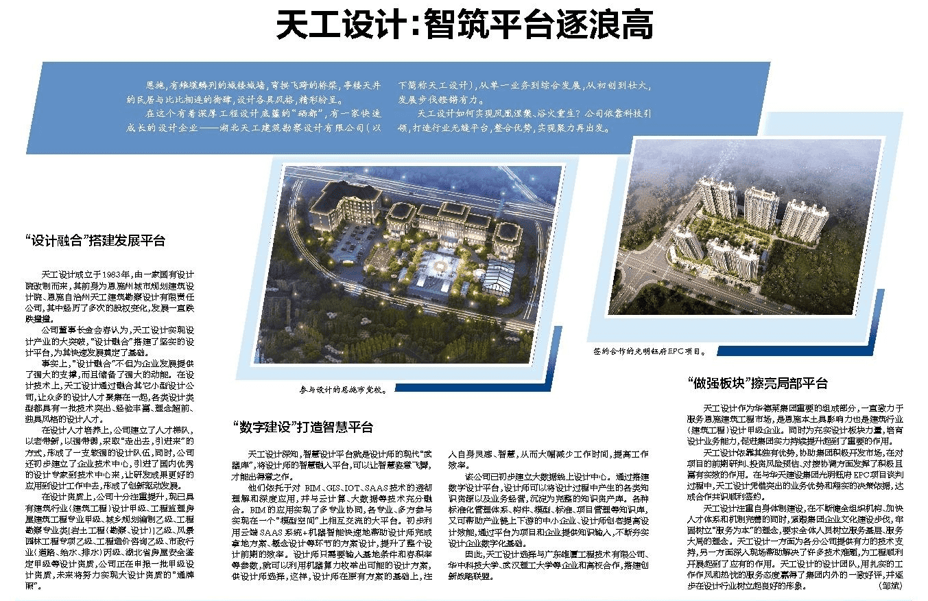 2022年 6月18日是湖北省第十二次中國共產黨全國代表大會開幕日。當日,湖北日報在其要聞第4版刊載《天工設計:智筑平臺逐浪高》要聞。要聞對湖北天工建筑勘察設計有限公司(以下簡稱“天工設計”)進行了詳細介紹,對天工設計的發展、設計人才的培養模式、設計資質的提升、“數字建設”智慧平臺的打造等方面進行了深層剖析,給與了高度評價…