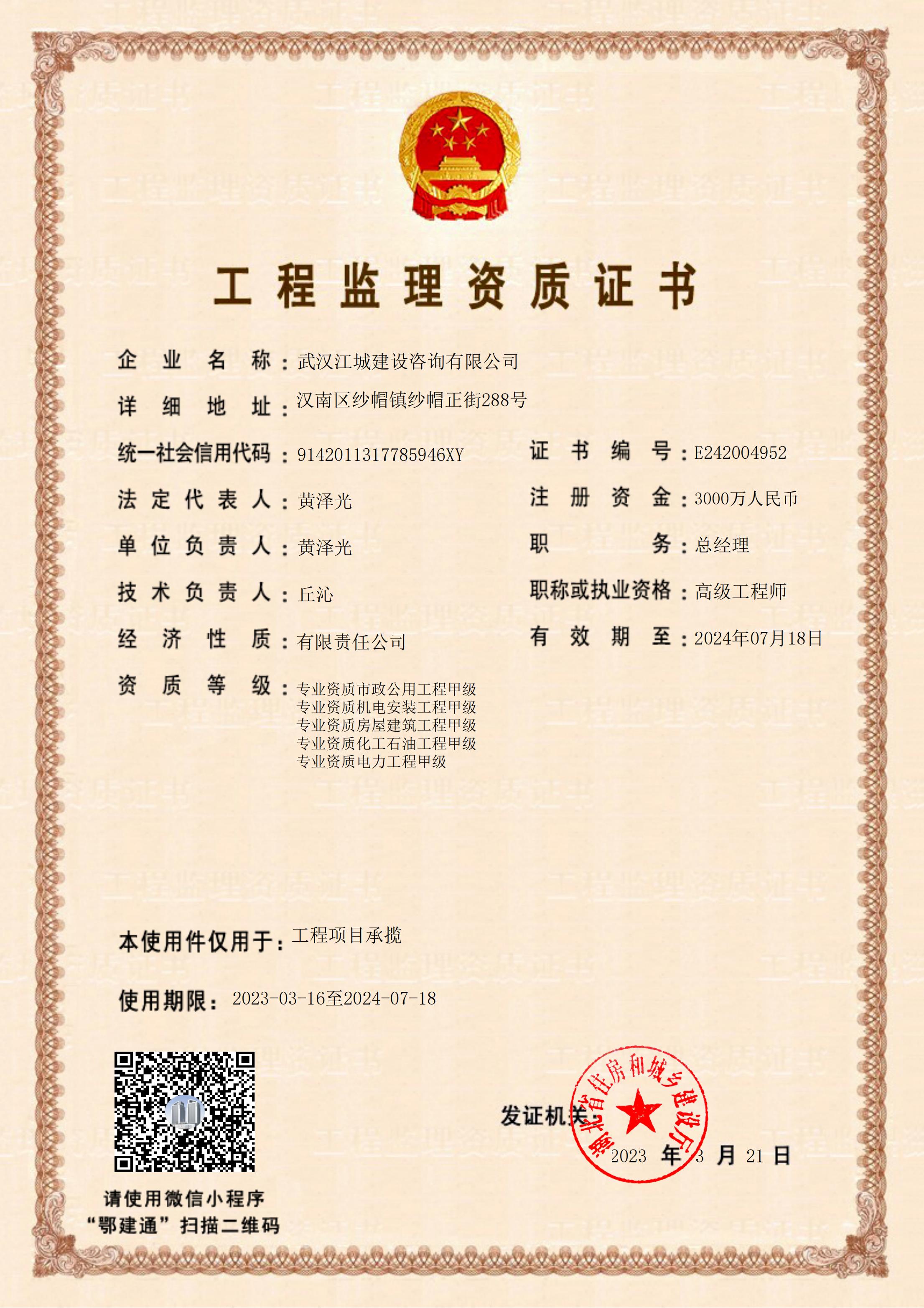 2023年3月17日,湖北省住房和城鄉建設廳公布了核準的工程監理企業資質——武漢江城建設咨詢有限公司(以下簡稱“武漢江城”)獲電力、化工石油專業甲級資質,形成了具備房建、市政、機電、電力、化工石油五項甲級資質的“新江城”?!靶陆恰睂⒁怎謪枈^發、篤行不怠的姿態勇毅前行,力行盡快申請到綜合級監理資質,屆時武漢江城將會以監理為契機,重組相關設計資質,努力為開拓發展全過程工程咨詢服務創造條件。