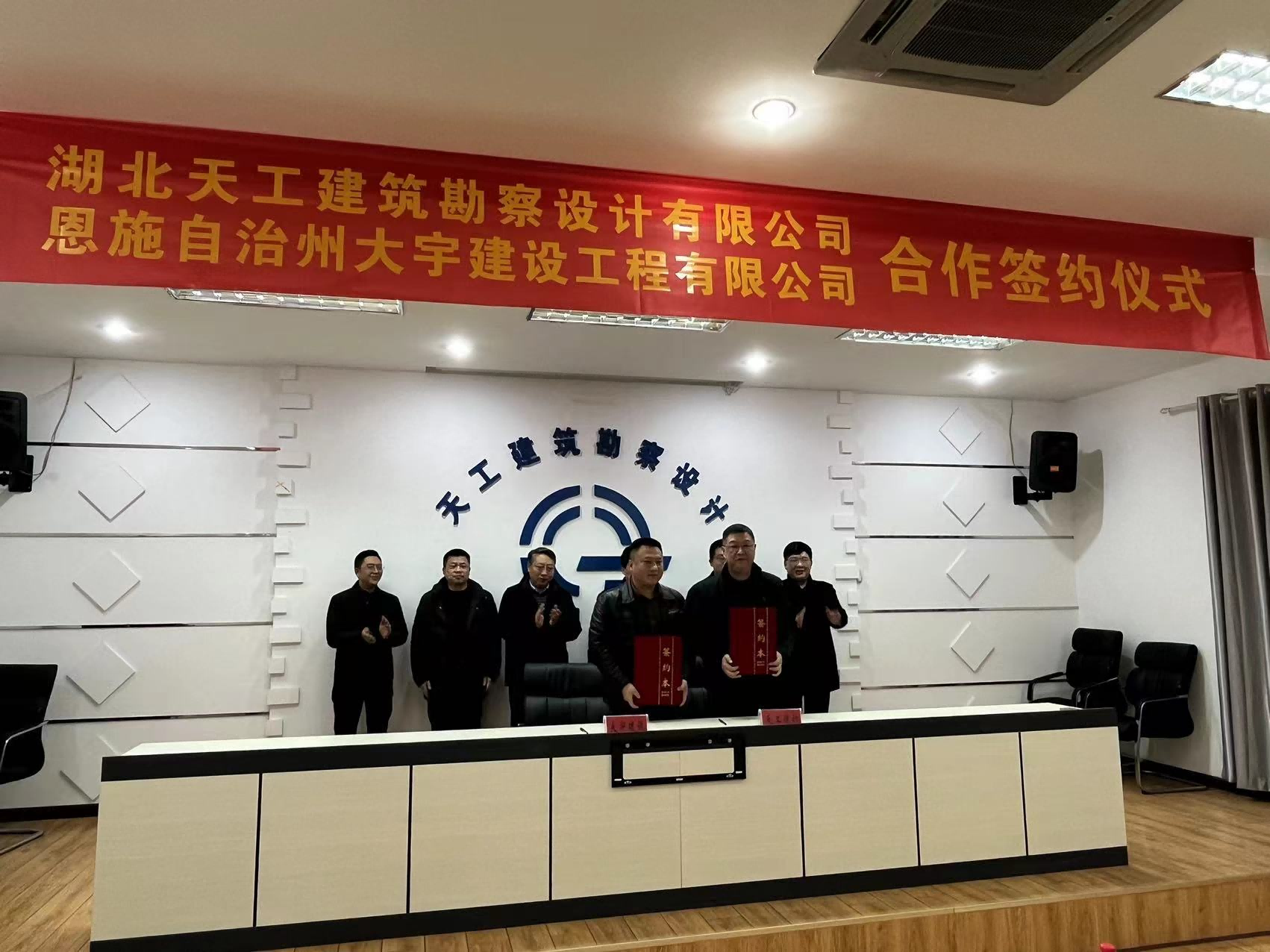 2024年1月18日(農歷臘月初八)下午,湖北天工建筑勘察設計有限公司與恩施自治州大宇建設有限公司合作簽約儀式在恩施市清江東路2號“天工設計”五樓會議室舉行。恩施州住建局黨組成員、副局長袁燕奇,恩施州住建局黨組成員、總工胡平,恩施職業技術學院建筑工程學院院長雷元凱,恩施州建筑業協會會長王保榮等領導出席了會議。湖北天工建筑勘察設計有限公司及恩施自治州大宇建設公司相關負責人及社會各界人士參加了會議。