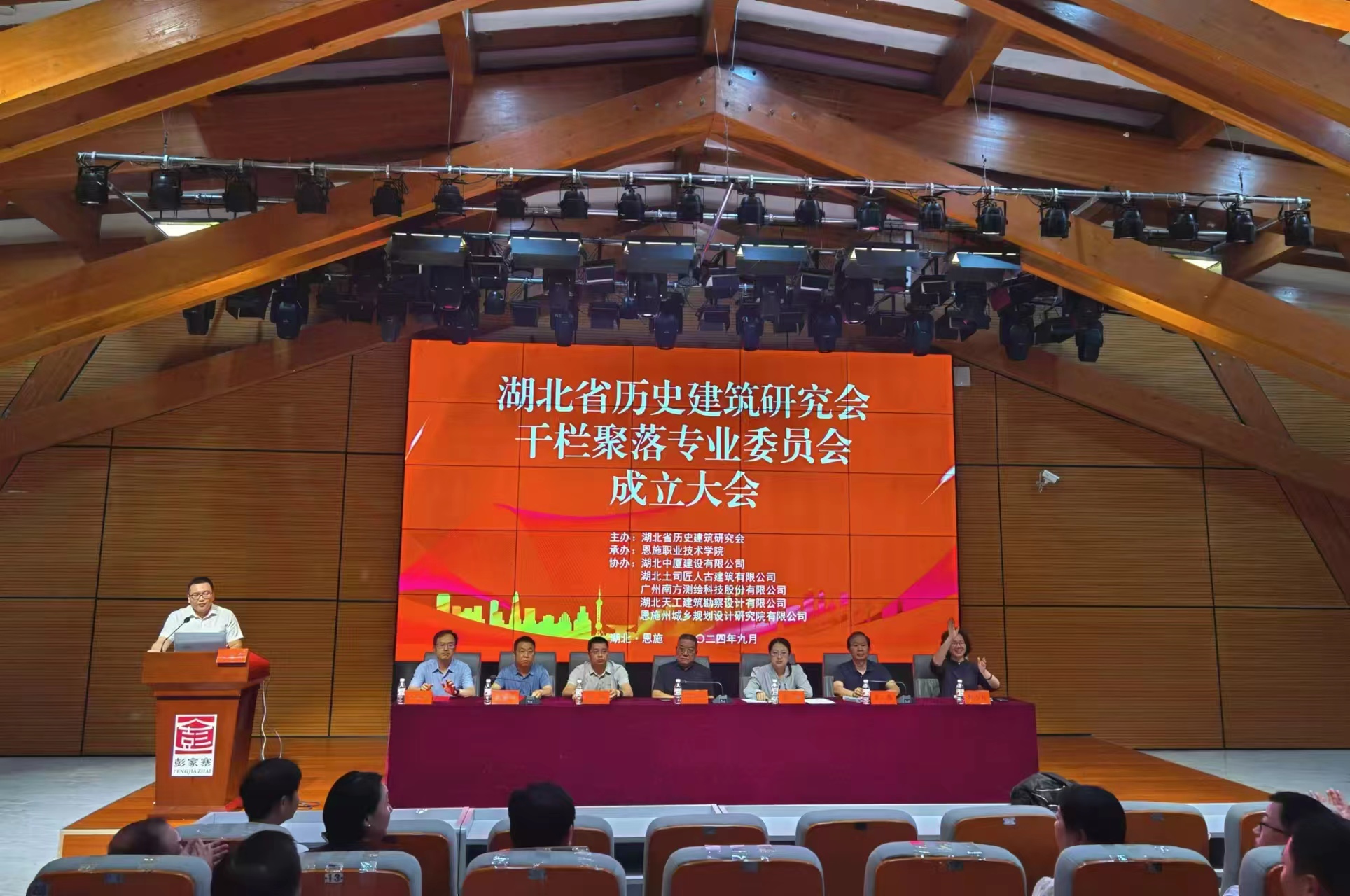 2024年9月19日,在宣恩縣彭家寨,召開了由湖北省歷史建筑研究會主辦,恩施職業技術學院承辦的湖北省歷史建筑研究會干欄聚落專業委員會成立大會。湖北省住建廳標準與科技處副處長李媛,湖北省歷史建筑研究會會長肖偉,副會長陸曉明、伍昌友,秘書長黃艷雁,華中科技大學建筑與城市規劃學院書記李小紅,恩施職業技術學院副院長張應坤,恩施州住房與城市更新局副局長楊波,宣恩縣副縣長楊海峰出席會議。成立大會還邀請到全國工程勘察設計大師,山東省工程設計大師申作偉作為特邀嘉賓出席。天工設計院院長車誼應邀出席該會議。