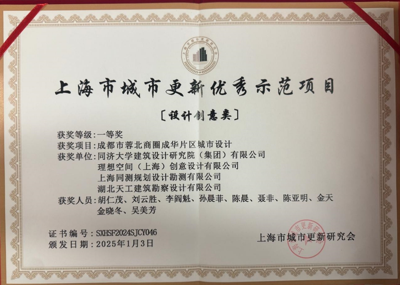 天工院聯合同濟大學建筑設計研究院(集團)有限公司、理想空間(上海)創意設計有限公司、上海同測規劃設計勘測有限公司設計的成都市蓉北商圈成華片區城市設計項目獲上海市城市更新優秀示范項目(設計創意類)一等獎。